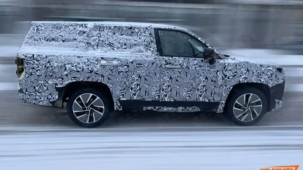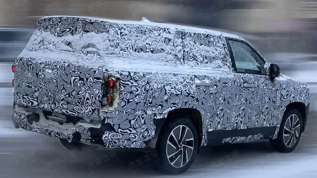 Задняя часть автомобиля полностью закрыта плотным камуфляжем, но на изображениях заметно, что дизайн кормы, размер окон третьего ряда и даже расположение антенны «акулий плавник» странные, а сам вседорожник более всего напоминает пикап с фальш-панелями кузова.