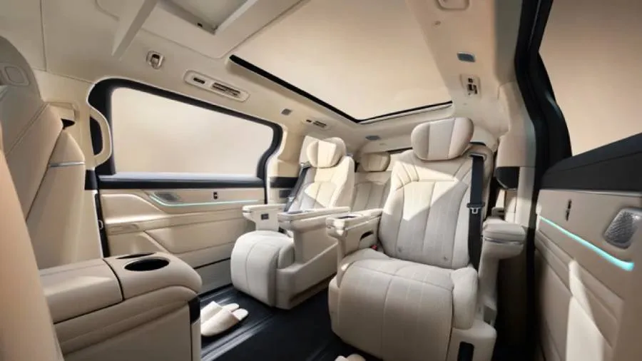 Производитель не спешит с демонстрацией интерьера нового вэна, представив на изображении только зону второго ряда сидений в трёхрядной компоновке. Пассажирские кресла здесь раздельные и, судя по всему, будут иметь широкий набор функций для обеспечения максимального комфорта. Есть предположение, что в линейке появится и более практичная версия, рассчитанная на восемь мест.