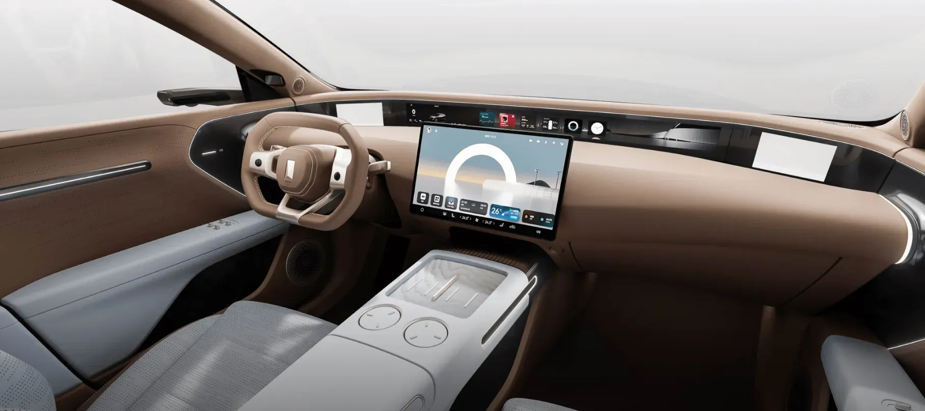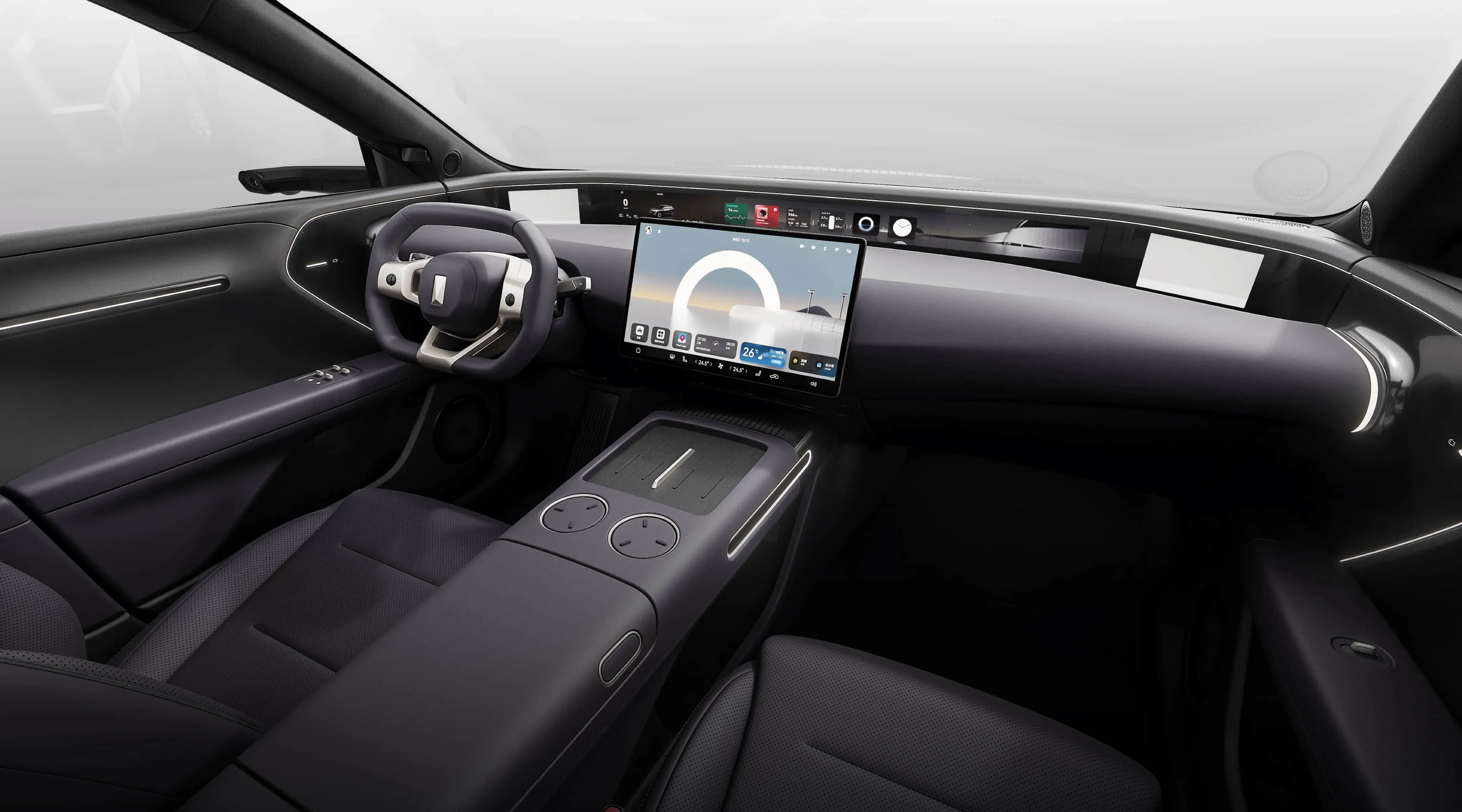 Интерьер Avatr 07 выполнен в двухцветной гамме и отличается минималистичным стилем. Передняя панель оснащена большим экраном, который тянется по всей длине торпедо. Мультимедийная система работает на операционной системе HarmonyOS (Huawei), что обеспечивает плавную и интуитивно понятную работу. Эргономичный руль удобно лежит в руках и имеет приплюснутые части с двух сторон.