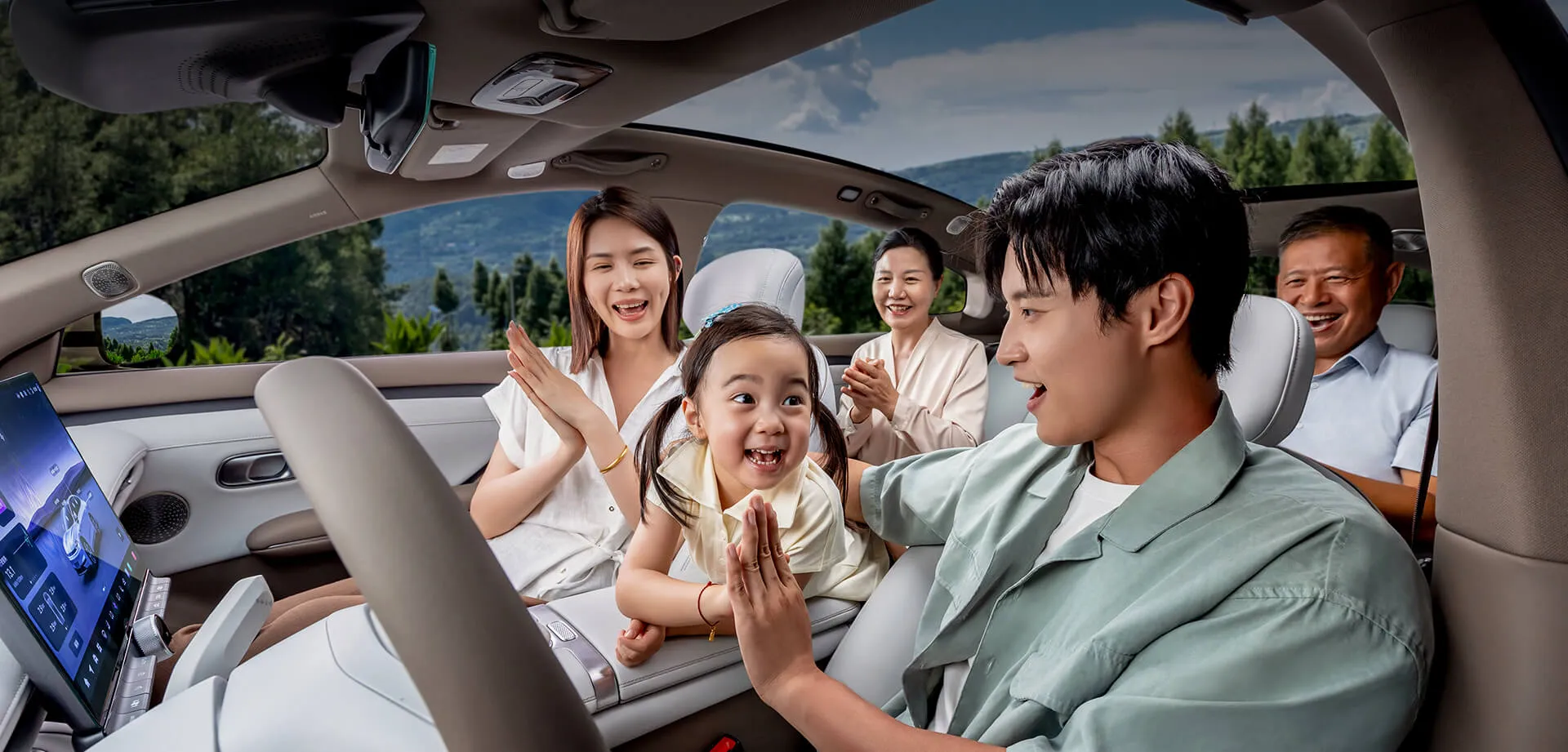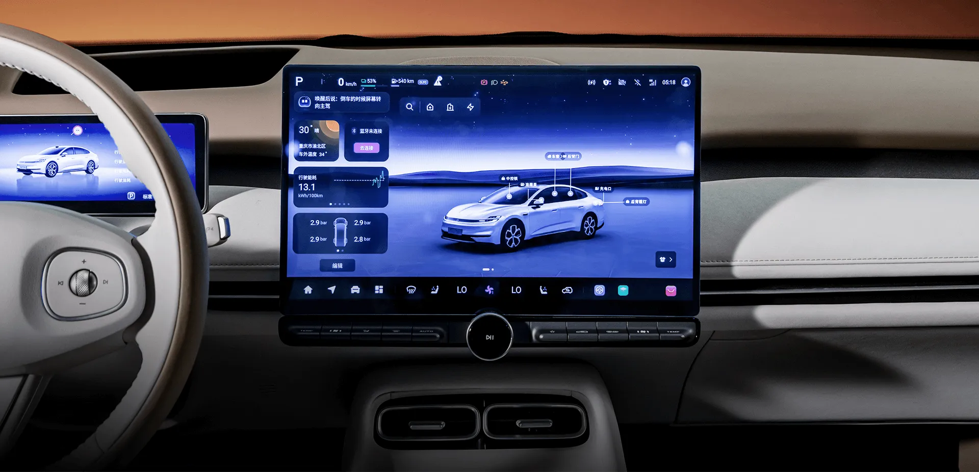 Интерьер выдержан в лаконичном стиле, но с акцентом на качество: в отделке использованы мягкие материалы и экокожа, создающие ощущение премиум-класса. Трёхуровневая архитектура передней панели объединяет “парящий” сенсорный экран диагональю 15,6 дюйма, цифровую приборную панель (10,17 дюйма) и блок физических клавиш управления климатом. Оснащение салона: