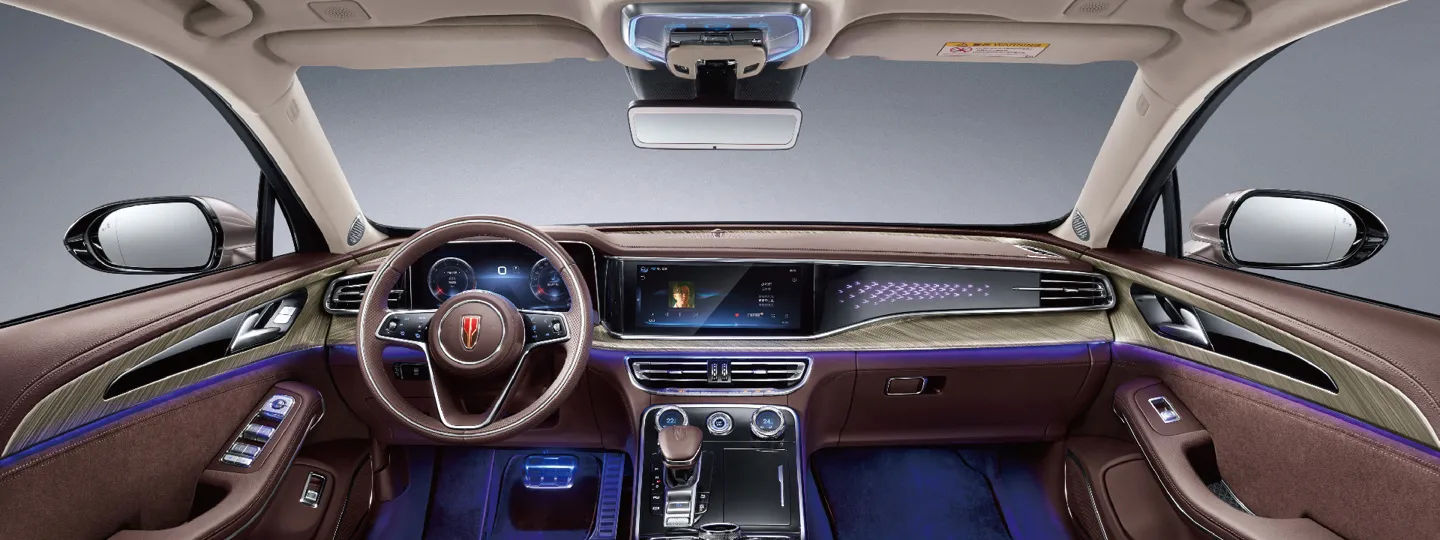 В салоне Hongqi H9 отделка премиум-класса: кожа Nappa, алюминий, натуральное дерево и хромированные элементы. Светлые тона создают ощущение простора и лёгкости, а атмосферная подсветка подчёркивает роскошь. Передние сиденья оснащены широким набором регулировок, подогревом, вентиляцией и функцией массажа. Для пассажиров сзади доступны персональные экраны управления климатом и настройкой передних кресел.