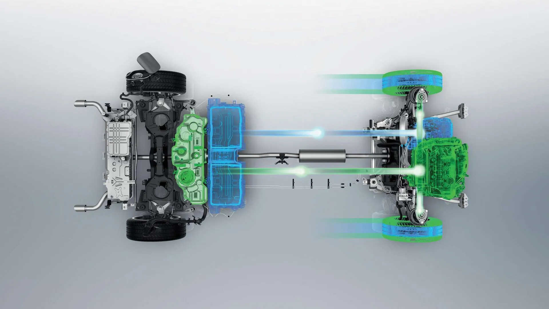 Гибридная трансмиссия сочетает 1,6-литровый бензиновый турбодвигатель мощностью 200 л.с. и два электромотора (110 л.с. на передней оси и 113 л.с. на задней), что в сумме дает впечатляющие 360 л.с. и 520 Н⋅м крутящего момента. Такая конфигурация обеспечивает полный привод и разгон до 100 километров в час за 5,2 секунды.