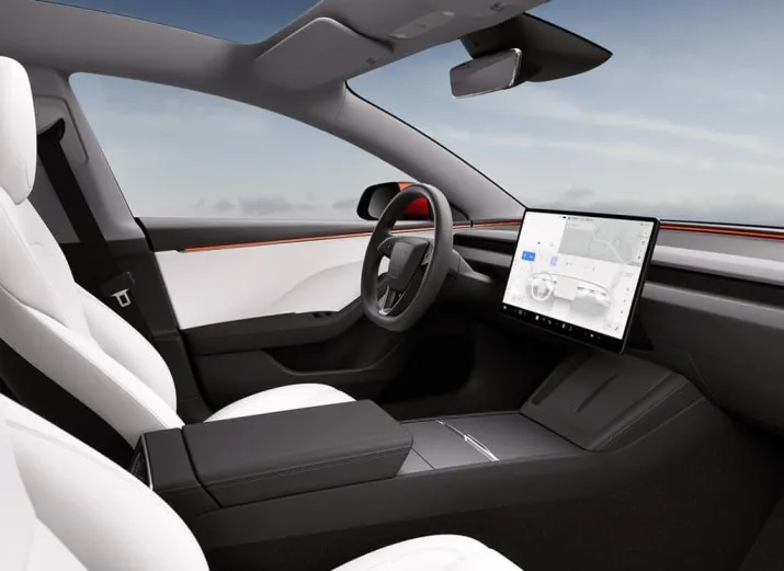 Интерьер: сохранился фирменный минималистичный стиль Tesla, но есть улучшения в материалах и эргономике. Центральный дисплей увеличился с 15 до 15,4 дюймов (с повышенным разрешением). Руль стал полностью сенсорным — управление поворотниками и селектором передач теперь осуществляется через сенсоры на руле, как в Model S и Model X. По салону проходит декоративная металлическая полоса с подсветкой, которая ночью создает амбиентное освещение. Для задних пассажиров предусмотрен 8-дюймовый экран с развлекательными функциями. Сиденья получили перфорированную отделку с вентиляцией и улучшенные материалы. Аудиосистема включает 17 динамиков против 9 в стандартной версии.