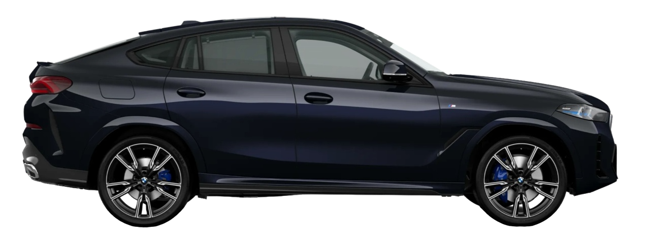 Интерьер BMW X6 — только премиальные материалы: кожа, декоративные вставки M Sport, антрацитовый потолок, стильные элементы M High-gloss Shadowline. Компоновка — 5 полноценных мест, второй ряд складывается. Передние сиденья идут с электрорегулировкой по 14 направлениям; опционально доступны вентиляция, подогрев и память положения водительского кресла. Центральный элемент — т.н. цифровой моноблок: 12,3-дюймовая приборная панель и 14,9-дюймовый экран мультимедиа с системой BMW iDrive 8 последнего поколения. Подсветка салона, четырёхзонный климат-контроль, аудиосистема Harman/Kardon, высокое качество отделки и множество розеток/разъёмов для зарядки. Экстерьер выделяется агрессивным профилем, стреловидными LED-фарами, элементами M Sport, крупными легкосплавными дисками (20 дюймов), окраской «металлик» и трапециевидными патрубками выхлопной системы. Также стоит отметить панорамную крышу, электропривод багажника, бесключевой доступ и камеры кругового обзора.