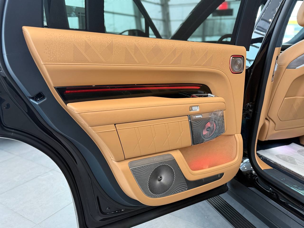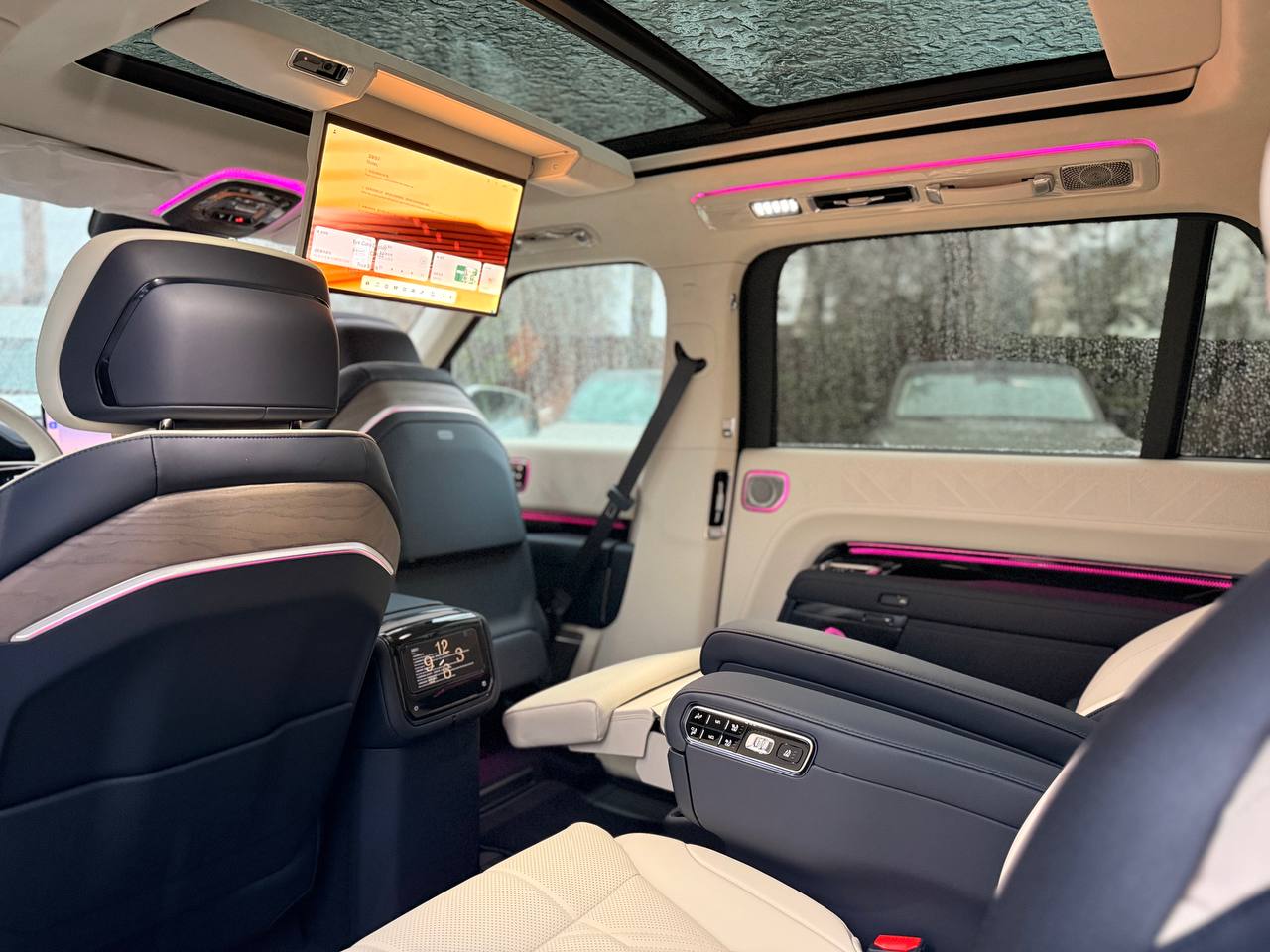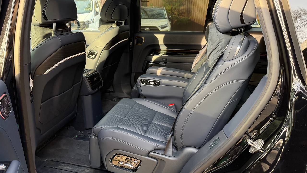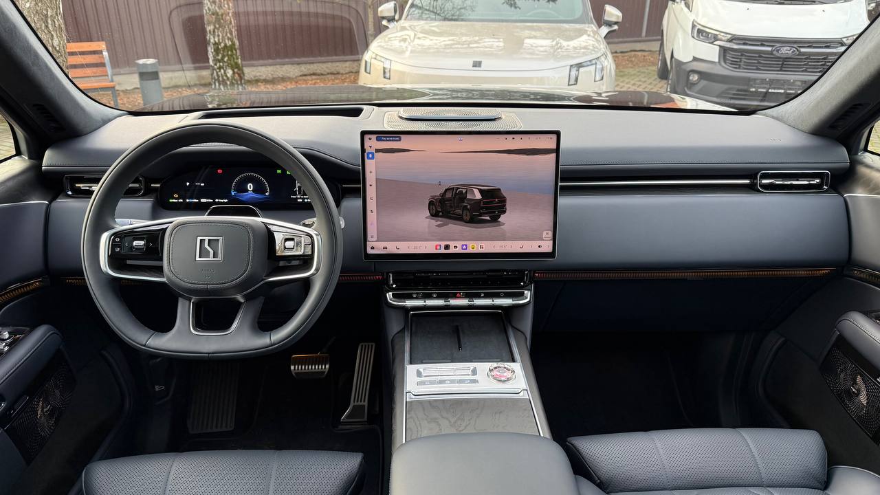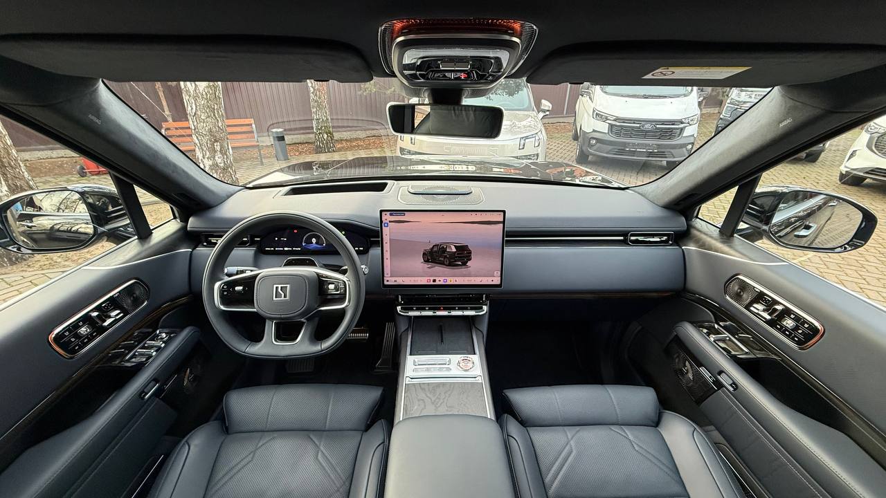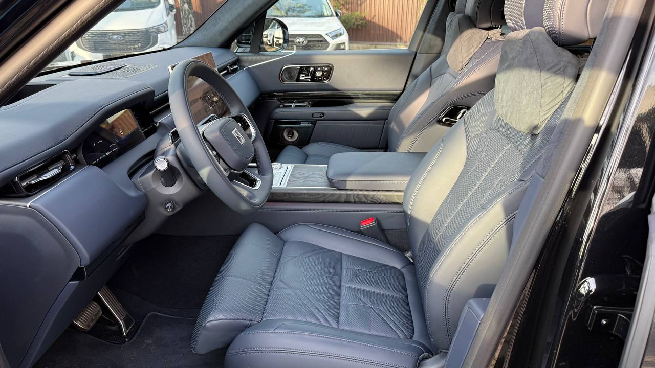 Салон выполнен в стиле «сдержанной роскоши» с отделкой из натуральной кожи Nappa, деревянным шпоном и алюминиевыми вставками. Компоновка 2+2+2 рассчитана на шесть посадочных мест. Второй ряд оснащён креслами Zero Gravity с режимом «невесомости»: электроприводные подлокотники и индивидуальный массаж уровня SPA. Для развлечений пассажиров заднего ряда в потолок встроен откидной 15,6-дюймовый дисплей. В подголовники передних сидений интегрированы динамики. Центральная консоль: большой сенсорный экран, несколько физических кнопок, селектор режимов движения и два беспроводных зарядных устройства. Стёкла сзади оснащены электрическими шторками. Трёхзонный климат-контроль поддерживает индивидуальные настройки температуры. Есть ионизатор воздуха с тремя видами ароматов и функцией автоматического включения при усталости. Для энергоэффективного обогрева используется тепловой насос. Мультимедийная система включает премиальную аудиосистему, голосовое управление и интеграцию с мобильными устройствами. Доступны порты USB и Type-C для зарядки гаджетов.