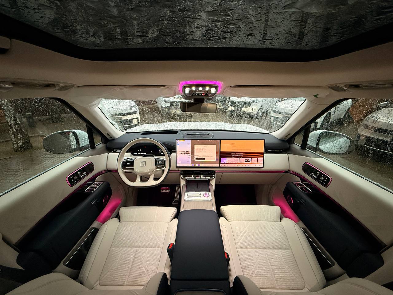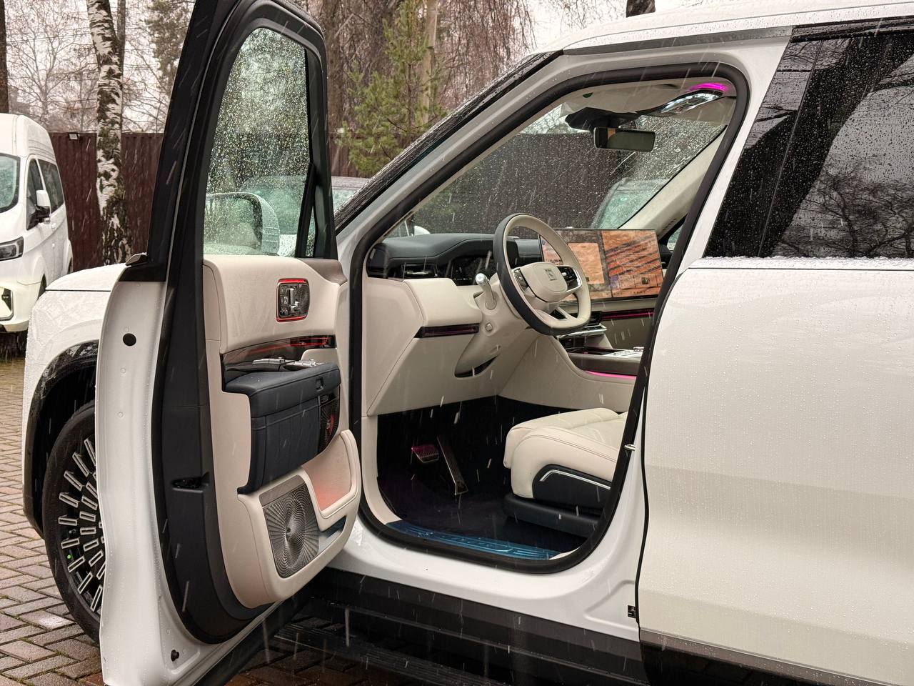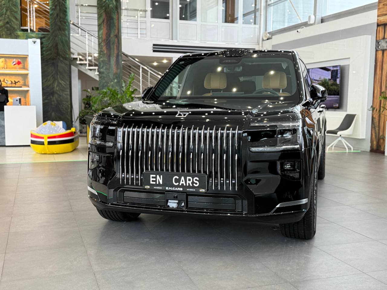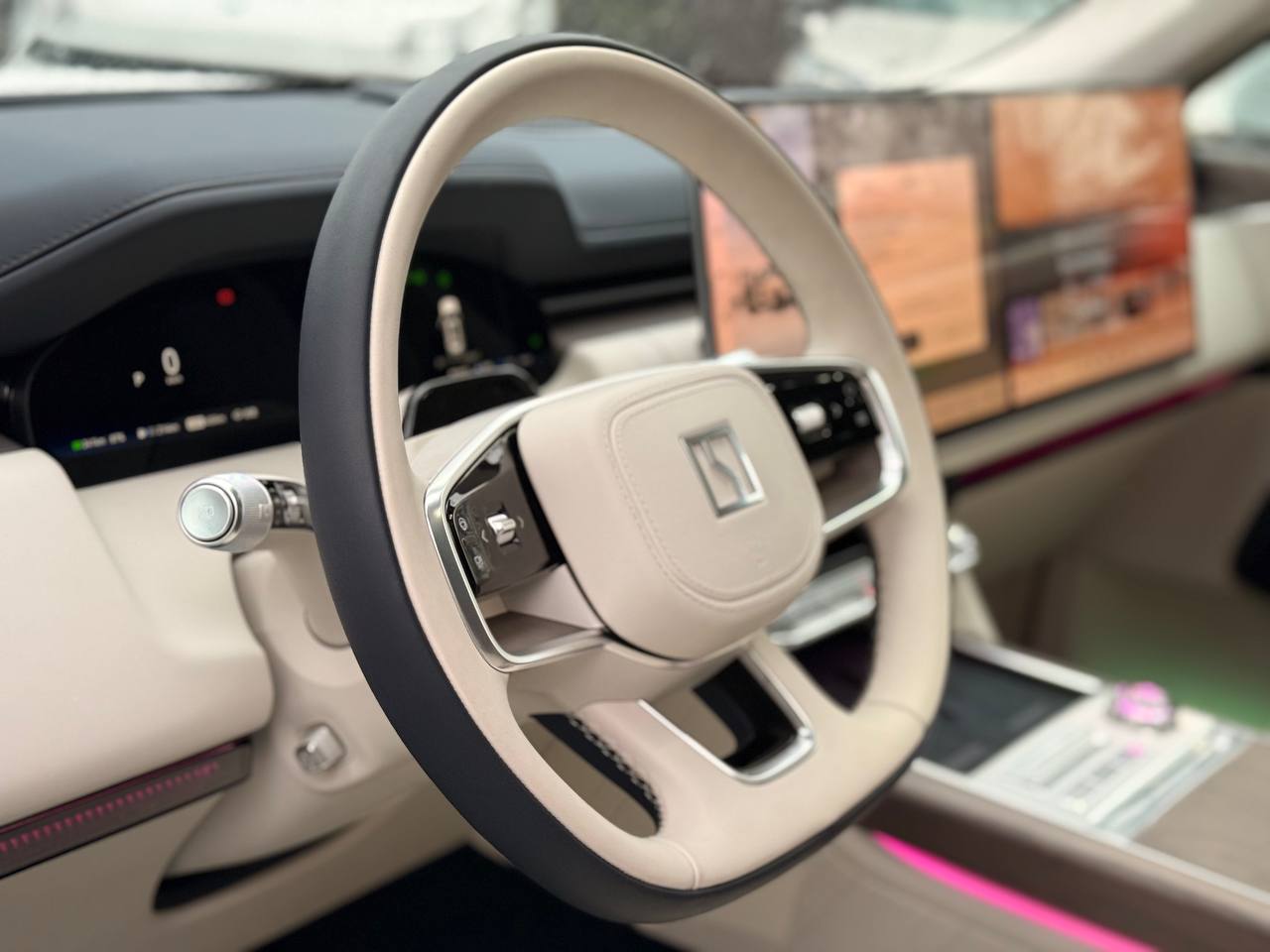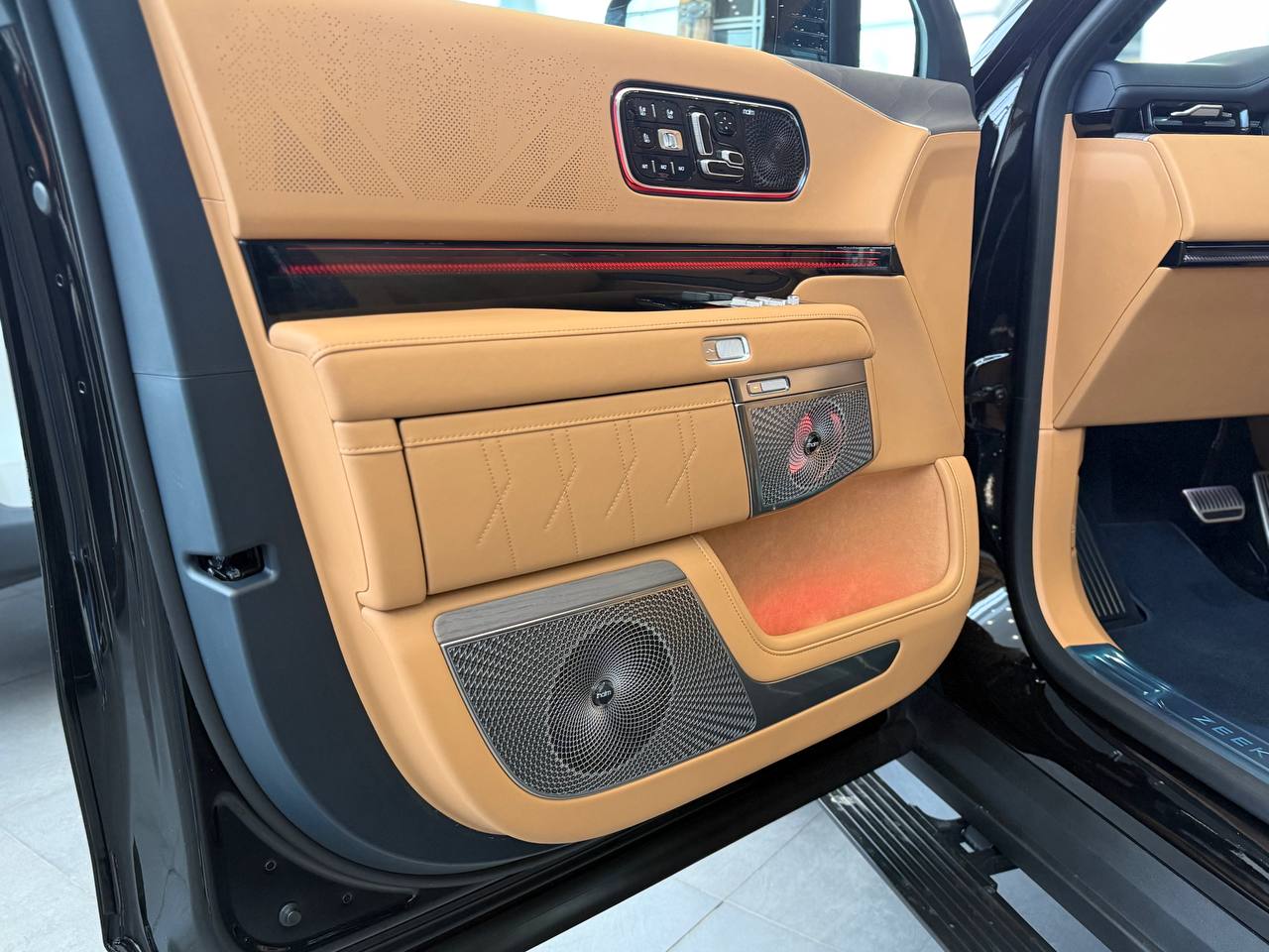 Салон выполнен в стиле «сдержанной роскоши» с отделкой из натуральной кожи Nappa, деревянным шпоном и алюминиевыми вставками. Компоновка 2+2+2 рассчитана на шесть посадочных мест. Второй ряд оснащён креслами Zero Gravity с режимом «невесомости»: электроприводные подлокотники и индивидуальный массаж уровня SPA. Для развлечений пассажиров заднего ряда в потолок встроен откидной 15,6-дюймовый дисплей. В подголовники передних сидений интегрированы динамики. Центральная консоль: большой сенсорный экран, несколько физических кнопок, селектор режимов движения и два беспроводных зарядных устройства. Стёкла сзади оснащены электрическими шторками. Трёхзонный климат-контроль поддерживает индивидуальные настройки температуры. Есть ионизатор воздуха с тремя видами ароматов и функцией автоматического включения при усталости. Для энергоэффективного обогрева используется тепловой насос. Мультимедийная система включает премиальную аудиосистему, голосовое управление и интеграцию с мобильными устройствами. Доступны порты USB и Type-C для зарядки гаджетов.